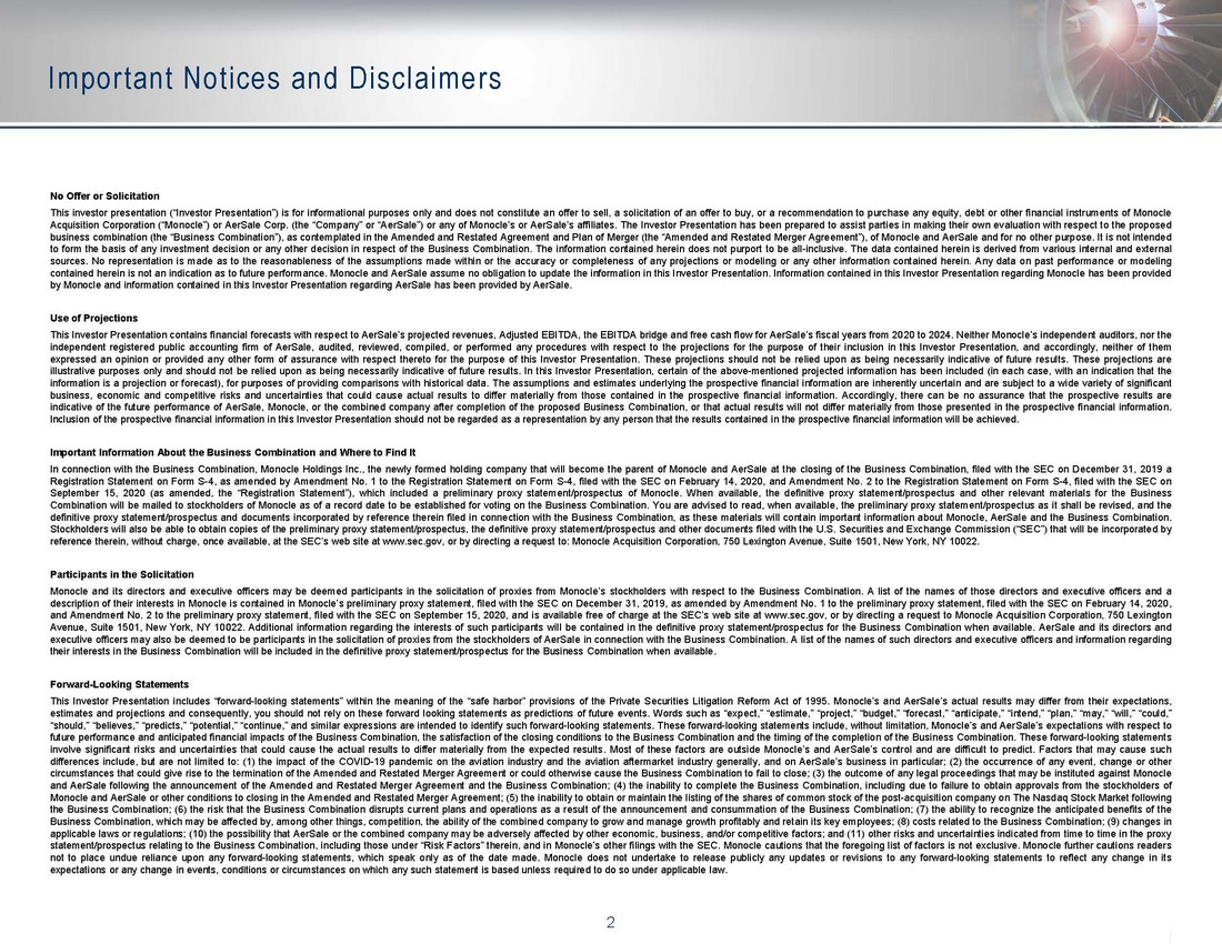 2 No Offer or Solicitation This investor presentation (“Investor Presentation”) is for informational purposes only and does not constitute an offer to sell, a solicitation of an offer to buy, or a recommendation to purchase any equity, debt or other financial instruments of Monocle Acquisition Corporation (“Monocle”) or AerSale Corp . (the “Company” or “AerSale”) or any of Monocle’s or AerSale’s affiliates . The Investor Presentation has been prepared to assist parties in making their own evaluation with respect to the proposed business combination (the “Business Combination”), as contemplated in the Amended and Restated Agreement and Plan of Merger (the “Amended and Restated Merger Agreement”), of Monocle and AerSale and for no other purpose . It is not intended to form the basis of any investment decision or any other decision in respect of the Business Combination . The information contained herein does not purport to be all - inclusive . The data contained herein is derived from various internal and external sources . No representation is made as to the reasonableness of the assumptions made within or the accuracy or completeness of any projections or modeling or any other information contained herein . Any data on past performance or modeling contained herein is not an indication as to future performance . Monocle and AerSale assume no obligation to update the information in this Investor Presentation . Information contained in this Investor Presentation regarding Monocle has been provided by Monocle and information contained in this Investor Presentation regarding AerSale has been provided by AerSale . Use of Projections This Investor Presentation contains financial forecasts with respect to AerSale’s projected revenues, Adjusted EBITDA, the EBITDA bridge and free cash flow for AerSale’s fiscal years from 2020 to 2024 . Neither Monocle’s independent auditors, nor the independent registered public accounting firm of AerSale, audited, reviewed, compiled, or performed any procedures with respect to the projections for the purpose of their inclusion in this Investor Presentation, and accordingly, neither of them expressed an opinion or provided any other form of assurance with respect thereto for the purpose of this Investor Presentation . These projections should not be relied upon as being necessarily indicative of future results . These projections are illustrative purposes only and should not be relied upon as being necessarily indicative of future results . In this Investor Presentation, certain of the above - mentioned projected information has been included (in each case, with an indication that the information is a projection or forecast), for purposes of providing comparisons with historical data . The assumptions and estimates underlying the prospective financial information are inherently uncertain and are subject to a wide variety of significant business, economic and competitive risks and uncertainties that could cause actual results to differ materially from those contained in the prospective financial information . Accordingly, there can be no assurance that the prospective results are indicative of the future performance of AerSale, Monocle, or the combined company after completion of the proposed Business Combination, or that actual results will not differ materially from those presented in the prospective financial information . Inclusion of the prospective financial information in this Investor Presentation should not be regarded as a representation by any person that the results contained in the prospective financial information will be achieved . Important Information About the Business Combination and Where to Find It In connection with the Business Combination, Monocle Holdings Inc . , the newly formed holding company that will become the parent of Monocle and AerSale at the closing of the Business Combination, filed with the SEC on December 31 , 2019 a Registration Statement on Form S - 4 , as amended by Amendment No . 1 to the Registration Statement on Form S - 4 , filed with the SEC on February 14 , 2020 , and Amendment No . 2 to the Registration Statement on Form S - 4 , filed with the SEC on September 15 , 2020 (as amended, the “Registration Statement”), which included a preliminary proxy statement/prospectus of Monocle . When available, the definitive proxy statement/prospectus and other relevant materials for the Business Combination will be mailed to stockholders of Monocle as of a record date to be established for voting on the Business Combination . You are advised to read, when available, the preliminary proxy statement/prospectus as it shall be revised, and the definitive proxy statement/prospectus and documents incorporated by reference therein filed in connection with the Business Combination, as these materials will contain important information about Monocle, AerSale and the Business Combination . Stockholders will also be able to obtain copies of the preliminary proxy statement/prospectus, the definitive proxy statement/prospectus and other documents filed with the U . S . Securities and Exchange Commission (“SEC”) that will be incorporated by reference therein, without charge, once available, at the SEC’s web site at www . sec . gov, or by directing a request to : Monocle Acquisition Corporation, 750 Lexington Avenue, Suite 1501 , New York, NY 10022 . Participants in the Solicitation Monocle and its directors and executive officers may be deemed participants in the solicitation of proxies from Monocle’s stockholders with respect to the Business Combination . A list of the names of those directors and executive officers and a description of their interests in Monocle is contained in Monocle’s preliminary proxy statement, filed with the SEC on December 31 , 2019 , as amended by Amendment No . 1 to the preliminary proxy statement, filed with the SEC on February 14 , 2020 , and Amendment No . 2 to the 
