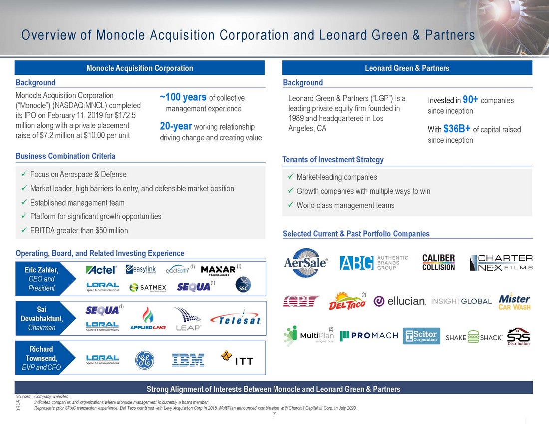 6 Presenters and Senior Leadership Richard Townsend Chief Financial Officer ▪ 39 years of finance, operating and strategy experience ▪ Managing Partner at Rangeley Capital ▪ Former EVP & CFO of Loral Space & Communications (NASDAQ:LORL) ▪ Previously served as Corporate Controller & Director of Strategy at ITT Industries (NYSE:ITT) ▪ Formerly served as Controller of EMEA region at IBM (NYSE:IBM) ▪ 35 years of senior leadership and management experience ▪ Board Member at exactEarth Ltd. (TSX:XCT), Maxar Technology Inc. (NYSE:MAXR) and Sequa Corporation ▪ Previously held President & COO role at Loral Space & Communications (NASDAQ:LORL) ▪ Formerly was a Partner at Fried, Frank, Harris, Shriver & Jacobson Eric Zahler Chief Executive Officer and President Sai Devabhaktuni Chairman ▪ 25 years of investing experience ▪ Board Member at Sequa Corporation ▪ Previously was EVP & Head of Corporate Distressed Portfolio Management at PIMCO ▪ Former Managing Principal at MHR Fund Management LLC ▪ Previously served as Member of the Event Driven Strategies Group at Highbridge Capital Management Monocle Acquisition Corporation ▪ More than 30 years of experience in aircraft leasing, finance, maintenance, supply chain services and airline operations with an extensive network of industry relationships ▪ Co - Founded AerSale in 2008 ▪ Co - Founder and former CEO of AeroTurbine, Inc., before selling the company in 2006 to AerCap (NYSE:AER) Nicolas Finazzo Co - Founder, Chairman & CEO AerSale Corp. ▪ 20 years of relevant industry experience in accounting and finance ▪ Joined AerSale in 2015 as Vice President of Finance & Corporate Controller ▪ Previously served as Senior Director of Corporate Accounting for Florida Power & Light, the regulated utility of NextEra Energy, Inc (NYSE:NEE) ▪ Formerly served as Controller during the IPO of NextEra Energy Partners, LP (NYSE:NEP) Martin Garmendia Chief Financial Officer ▪ Over 30 years of experience in aircraft engine sales, leasing and MRO services ▪ Co - Founded AerSale in 2008 ▪ Co - Founder and former COO of AeroTurbine, Inc., before selling the company in 2006 to AerCap (NYSE:AER) ▪ Manager of Powerplant and Warranty Administration for Braniff Airways ▪ Director of Engine Maintenance Sales for Greenwich Air Services (acquired by GE Engine Services) Robert Nichols Co - Founder, Executive Vice Chairman & President