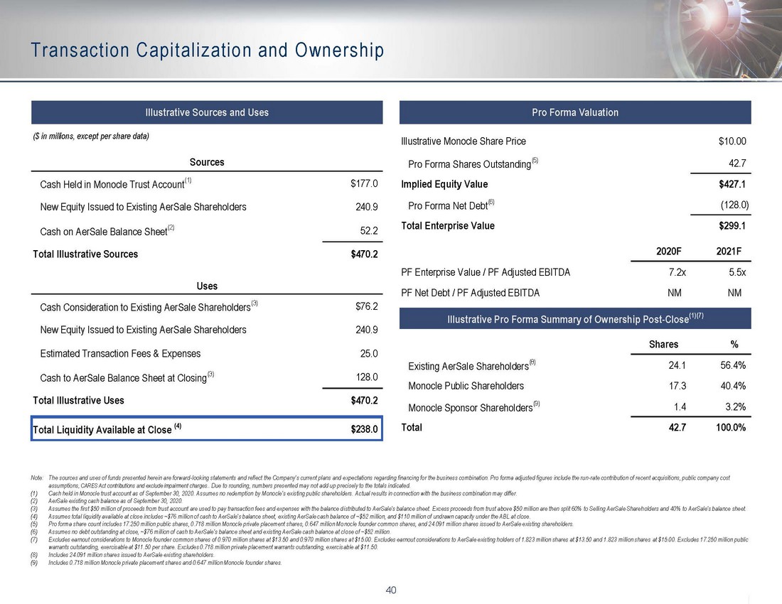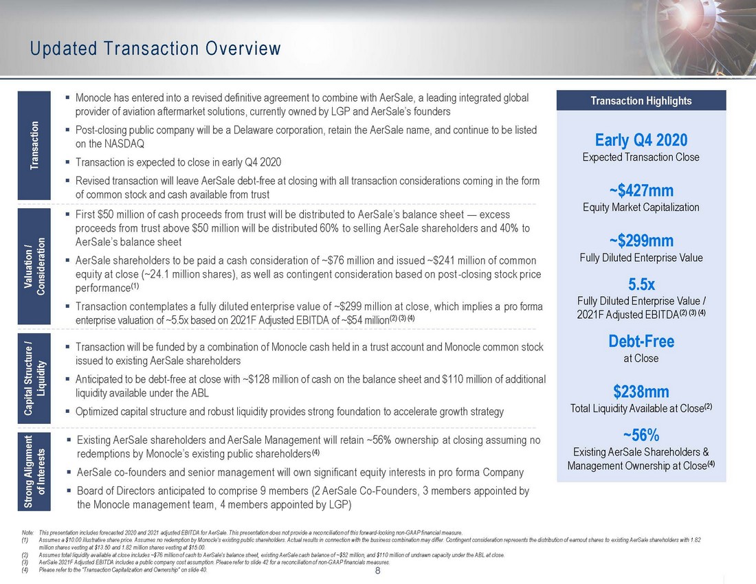 8 Updated Transaction Overview Note: This presentation includes forecasted 2020 and 2021 adjusted EBITDA for AerSale. This presentation does not provide a reco nciliation of this forward - looking non - GAAP financial measure. (1) Assumes a $10.00 illustrative share price. Assumes no redemption by Monocle’s existing public shareholders. Actual results in co nnection with the business combination may differ. Contingent consideration represents the distribution of earnout shares to exi sting AerSale shareholders with 1.82 million shares vesting at $13.50 and 1.82 million shares vesting at $15.00. (2) Assumes total liquidity available at close includes ~$76 million of cash to AerSale’s balance sheet, existing AerSale cash ba lan ce of ~$52 million, and $110 million of undrawn capacity under the ABL at close. (3) AerSale 2021F Adjusted EBITDA includes a public company cost assumption. Please refer to slide 42 for a reconciliation of non - GA AP financials measures. (4) Please refer to the “Transaction Capitalization and Ownership” on slide 40. Valuation / Consideration ▪ First $50 million of cash proceeds from trust will be distributed to AerSale’s balance sheet — excess proceeds from trust above $50 million will be distributed 60% to selling AerSale shareholders and 40% to AerSale’s balance sheet ▪ AerSale shareholders to be paid a cash consideration of ~$76 million and issued ~$241 million of common equity at close (~24.1 million shares), as well as contingent consideration based on post - closing stock price performance (1) ▪ Transaction contemplates a fully diluted enterprise value of ~$299 million at close, which implies a pro forma enterprise valuation of ~5.5x based on 2021F Adjusted EBITDA of ~$54 million (2) (3) (4) Capital Structure / Liquidity ▪ Transaction will be funded by a combination of Monocle cash held in a trust account and Monocle common stock issued to existing AerSale shareholders ▪ Anticipated to be debt - free at close with ~$128 million of cash on the balance sheet and $110 million of additional liquidity available under the ABL ▪ Optimized capital structure and robust liquidity provides strong foundation to accelerate growth strategy Strong Alignment of Interests ▪ Existing AerSale shareholders and AerSale Management will retain ~56% ownership at closing assuming no redemptions by Monocle’s existing public shareholders (4) ▪ AerSale co - founders and senior management will own significant equity interests in pro forma Company ▪ Board of Directors anticipated to comprise 9 members (2 AerSale Co - Founders, 3 members appointed by the Monocle management team, 4 members appointed by LGP) Transaction ▪ Monocle has entered into a revised definitive agreement to combine with AerSale, a leading integrated global provider of aviation aftermarket solutions, currently owned by LGP and AerSale’s founders ▪ Post - closing public company will be a Delaware corporation, retain the AerSale name, and continue to be listed on the NASDAQ ▪ Transaction is expected to close in early Q4 2020 ▪ Revised transaction will leave AerSale debt - free at closing with all transaction considerations coming in the form of common stock and cash available from trust Early Q4 2020 Expected Transaction Close ~$427mm Equity Market Capitalization 5.5x Fully Diluted Enterprise Value / 2021F Adjusted EBITDA (2) (3) (4) Transaction Highlights Debt - Free at Close ~56% Existing AerSale Shareholders & Management Ownership at Close (4) $238mm Total Liquidity Available at Close (2) ~$299mm Fully Diluted Enterprise Value