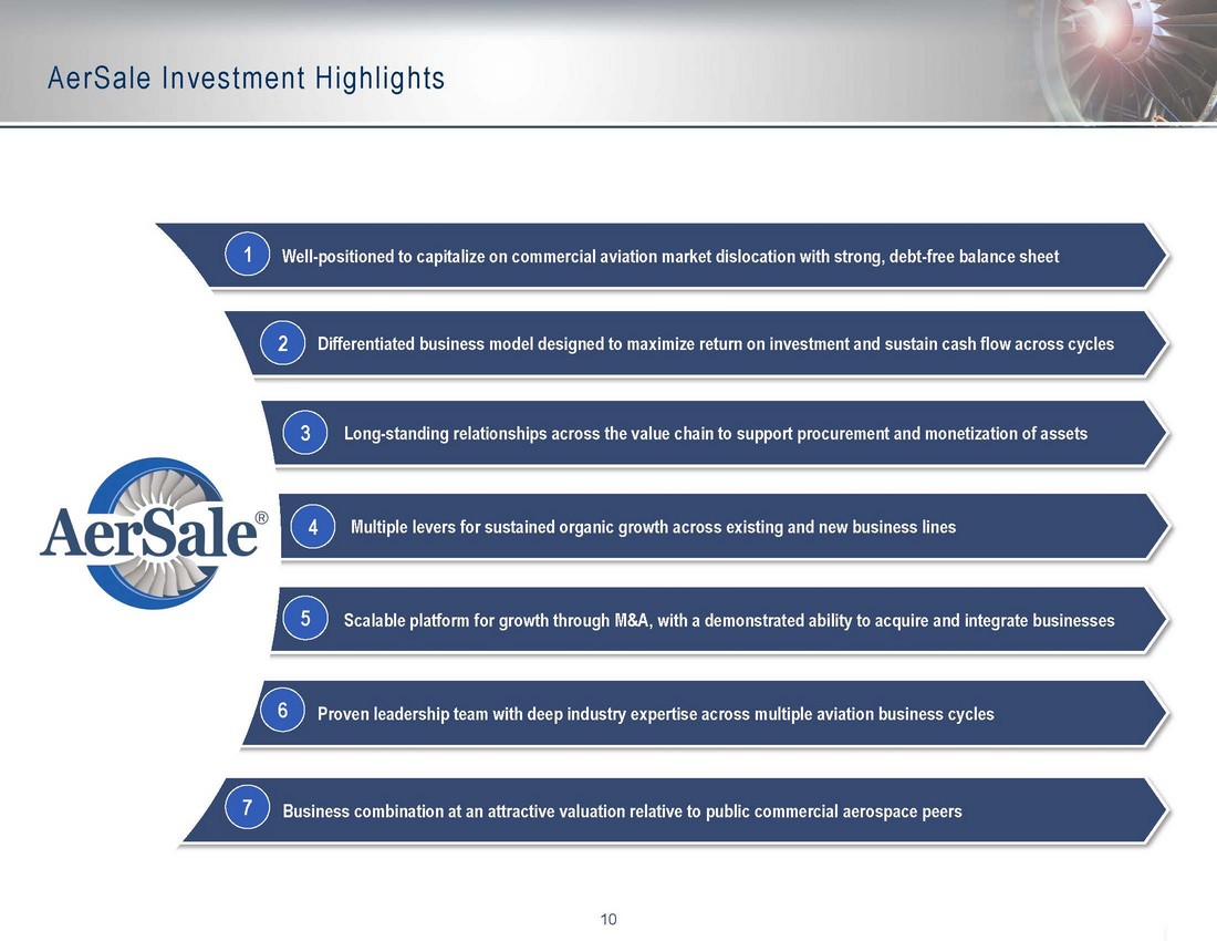 9 Global Leader in Aviation Aftermarket Products and Services Source: AerSale Management. Note: Pro forma adjusted figures include the run - rate contribution of recent acquisitions, public company cost assumptions, CARE S Act contributions and exclude impairment charges. (1) Please refer to slide 42 for a reconciliation of non - GAAP financials measures. Asset Management Solutions TechOps USM & Flight Equipment Sales Engine & Aircraft Management Aircraft & Components MRO Engineered Solutions Key Financials (PF2019A) $238.5mm in Revenue $74.3mm in Gross Profit 31.1% in Margin 73% of PF Revenue Key Financials (PF2019A) $86.4mm in Revenue $23.0mm in Gross Profit 26.7% in Margin 27% of PF Revenue Total Company Performance Snapshot (1) Pro Forma Adjusted Revenue ($ in millions) Pro Forma Adjusted EBITDA Margin 19.1% 18.5% 13.0% 21.2% Integrated Offerings Provide Competitive Advantages Market Intelligence & Proprietary Data ▪ Holistic insights into aviation aftermarket ▪ Data - driven investment decision - making with 10+ years of transactional data Integrated Business Model ▪ Multiple avenues to extract value with synergistic business segments ▪ Fully integrated mid - technology flight equipment offerings Differentiated Regulatory Position ▪ “Unlimited” repair station licenses ▪ Ability to fast track new FAA approved capabilities Long - Term Customer Relationships ▪ Established customer relationships over 30+ years ▪ Key downstream supply / demand perspectives 17.6% $219 $280 $325 $197 $307 PF2017A PF2018A PF2019A 2020F 2021F $29 $54 $60 $42 $54 PF2017A PF2018A PF2019A 2020F 2021F