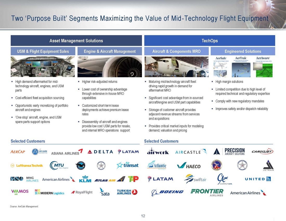 10 7 Business combination at an attractive valuation relative to public commercial aerospace peers 4 Multiple levers for sustained organic growth across existing and new business lines 6 Proven leadership team with deep industry expertise across multiple aviation business cycles 2 Differentiated business model designed to maximize return on investment and sustain cash flow across cycles 3 Long - standing relationships across the value chain to support procurement and monetization of assets 5 Scalable platform for growth through M&A, with a demonstrated ability to acquire and integrate businesses 1 Well - positioned to capitalize on commercial aviation market dislocation with strong, debt - free balance sheet AerSale Investment Highlights