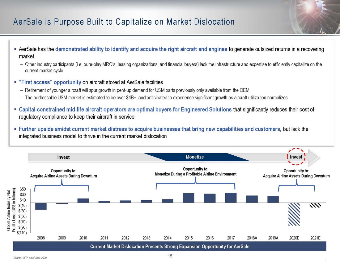 14 Increased Aircraft Retirements Generate Attractive Opportunities for AerSale Focus Aircraft Platforms 0% 1% 2% 3% 4% 5% 6% 7% 8% 9% 10% 1990 1994 1998 2002 2006 2010 2014 2018 2022E 0% 1% 2% 3% 4% 5% 6% 7% 8% Deliveries Retirements Retirements as a % of prior year's fleet: 2020E = 5.0% Deliveries as a % of prior year's fleet: 2020E = 3.4% Source: Ascend, Wall Street research. Aircraft Retirements Expected to Increase in the Near - Term 2020E Retirements: 1,400 2020E Deliveries: 989 Retirements Expected Across All Platforms — Offer Unprecedented Acquisition Pipeline for AerSale Source: Ascend, Company data, Wall Street research. $20B Opportunity 11% 58% 7% 19% 56% 22% 15% 19% 34% 18% 65% 29% 60% 48% 35% 100% 33% 100% 80% 93% 0 100 200 300 400 500 600 700 800 2020 - 2022E Retirements 2020-2022E Retirements Retirements as % of Fleet 0 100 200 300 400 500 600 2020 - 2022E Retirements 11% 58% 7% 19% 56% 22% 15% 19% 34% 18% 65% 29% 60% 48% 35% 100% 33% 100% 80% 93%