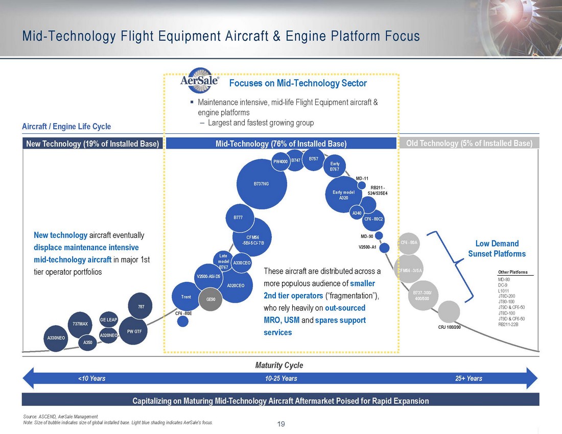 18 Select Near - Term Acquisition Opportunities Opportunity #1 Opportunity #2 Opportunity #3 Type / Quantity Up to 62 737 - 800s 12 757 - 200s (PW2000 Engines) 9 A330 - 300s Expected Bid Timing Sep 2020 Oct / Nov 2020 Oct 2020 AerSale Asset Acquisition History (1) ($ in millions) AerSale Has a Highly Structured & Proven Process to Execute Amid Market Dislocation (1) Asset acquisition history defined as spend on assets. (2) Excludes asset acquisitions related to Xtra Airways, a former AerSale subsidiary. (2) (2) Near - Term Acquisition Opportunities ▪ AerSale has a proven history acquiring assets amidst broader market uncertainty The Company’s significant asset pipeline and proprietary tracking enables the business to act opportunistically vs. reactively ▪ During prior down cycles, AerSale strategically deployed substantial capital to acquire assets at discounted levels while airlines experienced periods of uncertainty and volatility during the Great Financial Crisis ▪ This strategy minimized capital expenditures during market up cycles, enabling AerSale to focus on profitably monetizing prior investments ▪ Expected IRR on new bid opportunities will be substantially above historically strong returns AerSale is Tooled to Address Counter - Cyclical Market Heavy Deployment of Capital Amid Downturn Highly Disciplined in Overheated Market $278 $85 $99 $65 $30 $131 $11 $14 $22 $84 2010A 2011A 2012A 2013A 2014A 2015A 2016A 2017A 2018A 2019A Post COVID - 19, the Company has entered into over $300 million IOIs for flight equipment