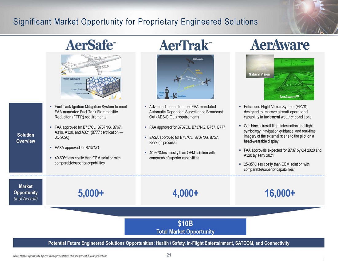 21 Significant Market Opportunity for Proprietary Engineered Solutions $10B Total Market Opportunity 5,000+ 4,000+ 16,000+ Market Opportunity (# of Aircraft) ▪ Fuel Tank Ignition Mitigation System to meet FAA mandated Fuel Tank Flammability Reduction (FTFR) requirements ▪ FAA approved for B737CL, B737NG, B767, A319, A320, and A321 (B777 certification — 3Q 2020) ▪ EASA approved for B737NG ▪ 40 - 60% less costly than OEM solution with comparable/superior capabilities ▪ Advanced means to meet FAA mandated Automatic Dependent Surveillance Broadcast Out (ADS - B Out) requirements ▪ FAA approved for B737CL, B737NG, B757, B777 ▪ EASA approved for B737CL, B737NG, B757, B777 (in process) ▪ 40 - 60% less costly than OEM solution with comparable/superior capabilities ▪ Enhanced Flight Vision System (EFVS) designed to improve aircraft operational capability in inclement weather conditions ▪ Combines aircraft flight information and flight symbology, navigation guidance, and real - time imagery of the external scene to the pilot on a head - wearable display ▪ FAA approvals expected for B737 by Q4 2020 and A320 by early 2021 ▪ 25 - 35% less costly than OEM solution with comparable/superior capabilities Solution Overview Potential Future Engineered Solutions Opportunities: Health / Safety, In - Flight Entertainment, SATCOM, and Connectivity Note: Market opportunity figures are representative of management 5 - year projections. Natural Vision AerAware™