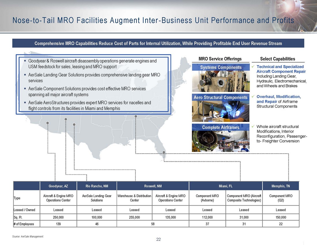 20 Integrated Business Segments Identify Highest Demand and Markets Business Segment Alternatives Realizes the highest value of mid - technology flight equipment by ensuring each aircraft, engine, and sub - component is returned to service in it s highest profitability capacity: ▪ Out - right retail sale ▪ Ready spare exchange ▪ Lease to generate recurring revenue ▪ Consume as aircraft, engine, or module to support owned, and third - party portfolio assets ▪ Lowers owned asset MRO ▪ Drives MRO margin Maximizes Optimal Flight Equipment Exit Opportunities Aircraft Airframe Utilize Internally Utilize Internally AerSale Component Solutions AerSale Landing Gear Solutions Third - Party MRO AerSale Goodyear / Roswell (MRO) Overhaul / Cargo Conv. Disassemble Engine Aux Power Unit Aircraft Management Engine Management Used Serviceable Material Sales Test Fail Sold to Customers Direct from MRO Divisions ▪ AerSale Goodyear ▪ AerSale Landing Gear Solutions, Rio Rancho ▪ AerSale Roswell ▪ AerSale Component Solutions, Miami ▪ Aircraft Composite Technologies, Miami ▪ Q2 Aviation, Memphis Monetizing Business Unit Avionics Pneumatics Hydraulics Wheels and Brakes Hull Nacelle Flight Controls Used Serviceable Material Sales AerSale AeroStructures TechOps Asset Management Solutions Landing Gear