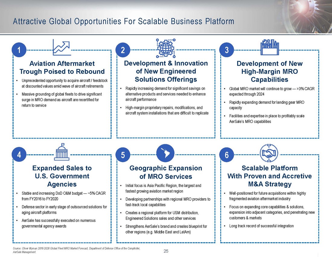 24 Executive Management Team Features Unrivaled Aftermarket Expertise ▪ Highly qualified executive leadership team with an average of 25 years of relevant industry experience , through multiple industry cycles, and wide - ranging business conditions ▪ Deep industry relationships through years of business transactions spanning major airlines, OEMs, MRO service providers, leasing, financiers and trading org anizations ▪ S enior management brings together the necessary expertise, infrastructure and resources to expertly execute on a broad range of aviation aftermarket opportunities 24 Martin Garmendia Chief Financial Officer & Treasurer 20 Yrs Experience Vanessa Machado Sr. VP Human Resources 20 Yrs Experience Functional Areas (1) Robert Nichols Co - Founder, Executive Vice Chairman & President Asset Management Solutions 25 Yrs Experience Craig Wright Division President Aircraft & Engine Management 20 Yrs Experience Nicolas Finazzo Co - Founder, Chairman, CEO & President TechOps 30 Yrs Experience Basil Barimo Division President MRO Services 30 Yrs Experience Iso Nezaj CTO & Division President Engineered Solutions 35 Yrs Experience Ron Wolf Sr. VP Quality 30 Yrs Experience (1) Functional areas report directly to Chairman and CEO. Gary Jones Division President Airframe & Engine Materials 37 Yrs Experience Enrique Pizzi Chief Information Officer 29 Yrs Experience Boris Streun Sr. VP Technical Services 30 Yrs Experience