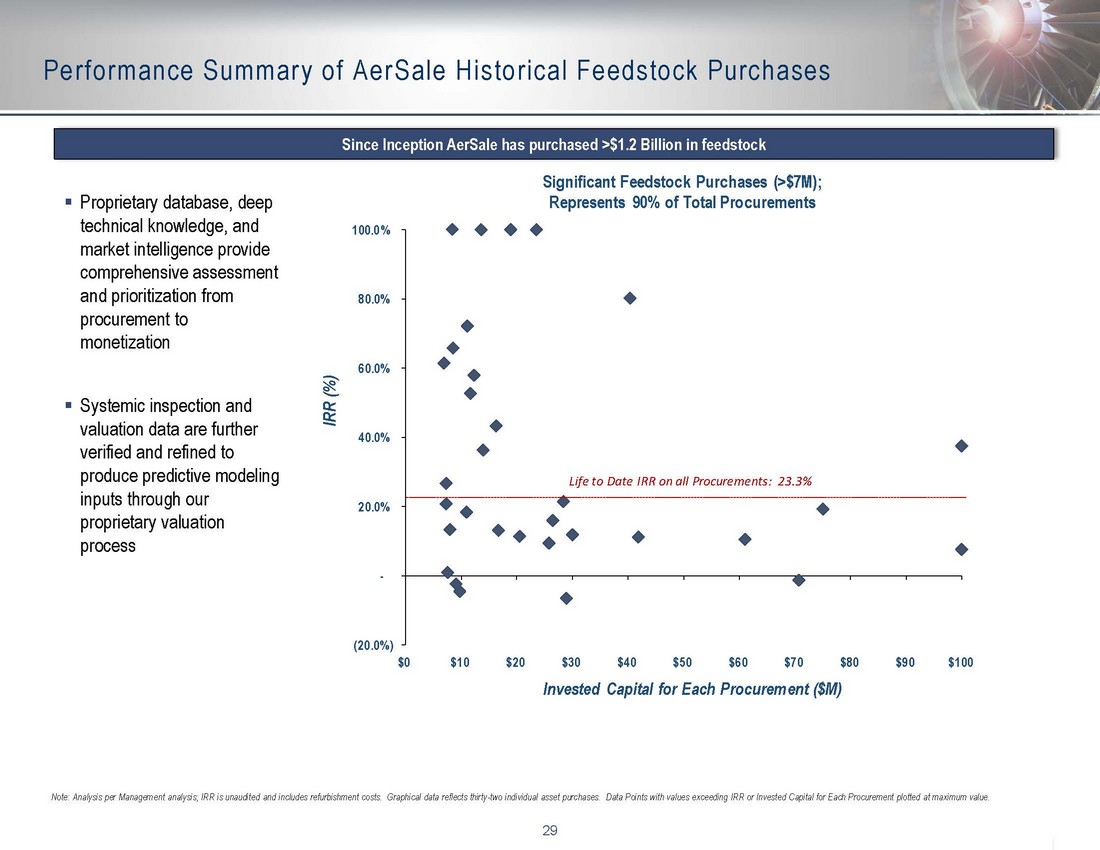 29 Performance Summary of AerSale Historical Feedstock Purchases Since Inception AerSale has purchased >$1.2 Billion in feedstock Note: Analysis per Management analysis; IRR is unaudited and includes refurbishment costs. Graphical data reflects thirty - two i ndividual asset purchases. Data Points with values exceeding IRR or Invested Capital for Each Procurement plotted at maximum va lue. ▪ Proprietary database, deep technical knowledge, and market intelligence provide comprehensive assessment and prioritization from procurement to monetization ▪ Systemic inspection and valuation data are further verified and refined to produce predictive modeling inputs through our proprietary valuation process (20.0%) - 20.0% 40.0% 60.0% 80.0% 100.0% $0 $10 $20 $30 $40 $50 $60 $70 $80 $90 $100 IRR (%) Invested Capital for Each Procurement ($M) Significant Feedstock Purchases (>$7M); Represents 90% of Total Procurements Life to Date IRR on all Procurements : 23.3%