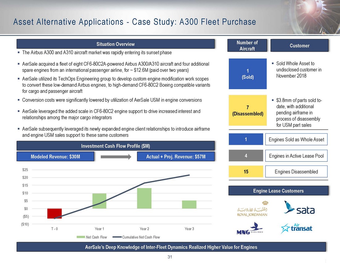 30 Business Integration - Case Study: B747 Fleet Purchase Situation Overview 4 (Sold) 6 (Leased) ▪ AerSale acquired 19 Boeing CF6 - 80C2 powered 747 - 400 aircraft from a major Asian operator downsizing its fleet following the last recession of 2008/2009, for ~ $214M (paid over two years) ▪ Utilized integrated capabilities across business units to extract highest value ▪ Engineered Solutions to modify aircraft seating for regulatory compliance ▪ Developed FAA certification (STC) for customer interior reconfigurations ▪ Utilized TechOps MRO capabilities to provide on - going engine, APU, and landing gear support programs ▪ Utilized Asset Management capabilities to deploy assets in optimal markets Aircraft Sales & Leasing in Passenger and Cargo configurations Engine Sales & Leasing in Passenger and Cargo markets Used Serviceable Material (USM) Sales and Exchanges CF6 - 80C2 Boeing 747 - 400 14 Engines in Active Lease Pool 42 Engines Disassembled AerSale’s Full Suite of Capabilities Drive Outsized Returns by Realizing Higher Value for Aircraft and their Sub - Components 9 (Disassembled) ▪ Disassembled to support USM part sales Investment Cash Flow Profile ($M) ($150) ($100) ($50) $0 $50 $100 $150 $200 T - 0 Year 1 Year 2 Year 3 Year 4 Year 5 Year 6 Year 7 Year 8 Year 9 Net Cash Flow Cumulative Net Cash Flow Modeled Revenue: $381M Actual + Proj. Revenue: $486M Number of Aircraft Customer