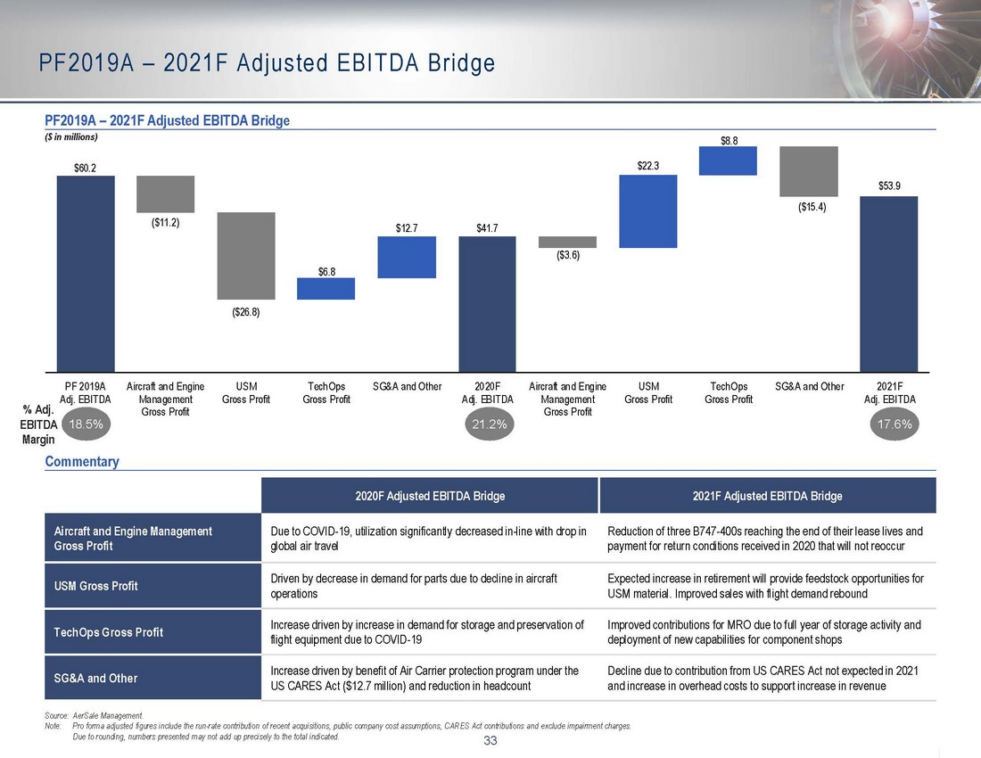 32 Post - Covid Investment Opportunity: Boeing 757 Fleet Acquisition Lease Aircraft ▪ In September 2020 AerSale contracted to acquire 24 Boeing 757 - 200 aircraft equipped with Rolls - Royce RB 211 - 535 engines, and 16 spare engines Significant advantages of on - site delivery of all aircraft and engines at AerSale’s Roswell, NM. based aircraft MRO facility Avoidance of relocation expenses to move aircraft to AerSale facilities (Estimated savings of $100+k per aircraft) Provides immediate access for equipment inspection, refurbishment, modification, and sales presentation Cash Flows Expected As Early As Fourth Quarter 2020 W ill Augment 2021 Visibility and Accelerate 2020/2021 Plan ▪ Holistic transaction valuation in consideration of all business unit monetizing alternatives to identify “highest and best us e” of assets ▪ ‘Sell’ vs. ‘lease’ placement, with collection of follow on post - lease USM cash flows’ alternatives considered for all aircraft a nd engines ▪ Utilization of extensive historical and real - time demand and pricing data, with enhanced accuracy through actual return - to - servi ce and scrappage inputs ▪ Cross - selling opportunities to ‘bundle’; Cargo conversion MRO, USM sales, Component MRO, and Engineered Solution upgrade (e.g. A erTrak/AerSafe) ▪ AerSale management shares a long history of successful high - yield fleet acquisitions in past recessionary markets ▪ AerSale has exceptional technical expertise, MRO capabilities and market savvy on B757 aircraft and Rolls - Royce RB211 - 535 engine s ▪ Rolls - Royce powered Boeing 757s rank among the most preferred cargo conversion aircraft due to: Low capital cost, Large payload, and Long range ▪ Post - Covid spike in e - commerce driving strong freighter demand, and expected to remain healthy over next few years ▪ High level of interest from large - scale cargo operators to purchase up to all aircraft for conversion to freighter service ▪ Strong demand for RB211 - 535 spare engines for purchase and/or lease, to avoid or defer expensive engine shop visits (circa $6 mi llion to overhaul) Rationale: Transaction: Monetizing Alternatives: Attractive Economics Investment Payback in Less Than a Year