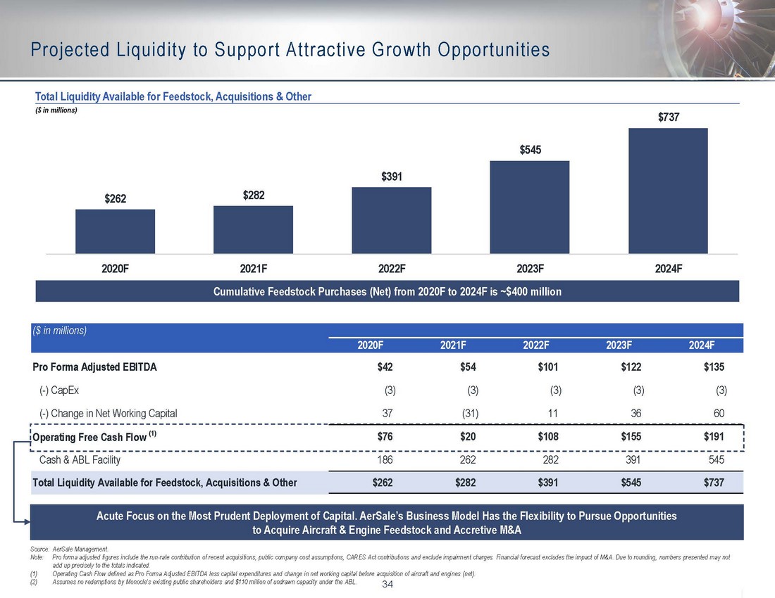 33 PF2019A – 2021F Adjusted EBITDA Bridge Source: AerSale Management. Note: Pro forma adjusted figures include the run - rate contribution of recent acquisitions, public company cost assumptions, CAR ES Act contributions and exclude impairment charges. Due to rounding, numbers presented may not add up precisely to the total indicated. PF2019A – 2021F Adjusted EBITDA Bridge Commentary 18.5% 17.6% ($ in millions) 21.2% 2020F Adjusted EBITDA Bridge 2021F Adjusted EBITDA Bridge Aircraft and Engine Management Gross Profit Due to COVID - 19, utilization significantly decreased in - line with drop in global air travel Reduction of three B747 - 400s reaching the end of their lease lives and payment for return conditions received in 2020 that will not reoccur USM Gross Profit Driven by decrease in demand for parts due to decline in aircraft operations Expected increase in retirement will provide feedstock opportunities for USM material. Improved sales with flight demand rebound TechOps Gross Profit Increase driven by increase in demand for storage and preservation of flight equipment due to COVID - 19 Improved contributions for MRO due to full year of storage activity and deployment of new capabilities for component shops SG&A and Other Increase driven by benefit of Air Carrier protection program under the US CARES Act ($12.7 million) and reduction in headcount Decline due to contribution from US CARES Act not expected in 2021 and increase in overhead costs to support increase in revenue % Adj. EBITDA Margin $60.2 $41.7 $53.9 ($11.2) ($26.8) $6.8 $12.7 ($3.6) $22.3 $8.8 ($15.4) PF 2019A Adj. EBITDA Aircraft and Engine Management Gross Profit USM Gross Profit TechOps Gross Profit SG&A and Other 2020F Adj. EBITDA Aircraft and Engine Management Gross Profit USM Gross Profit TechOps Gross Profit SG&A and Other 2021F Adj. EBITDA