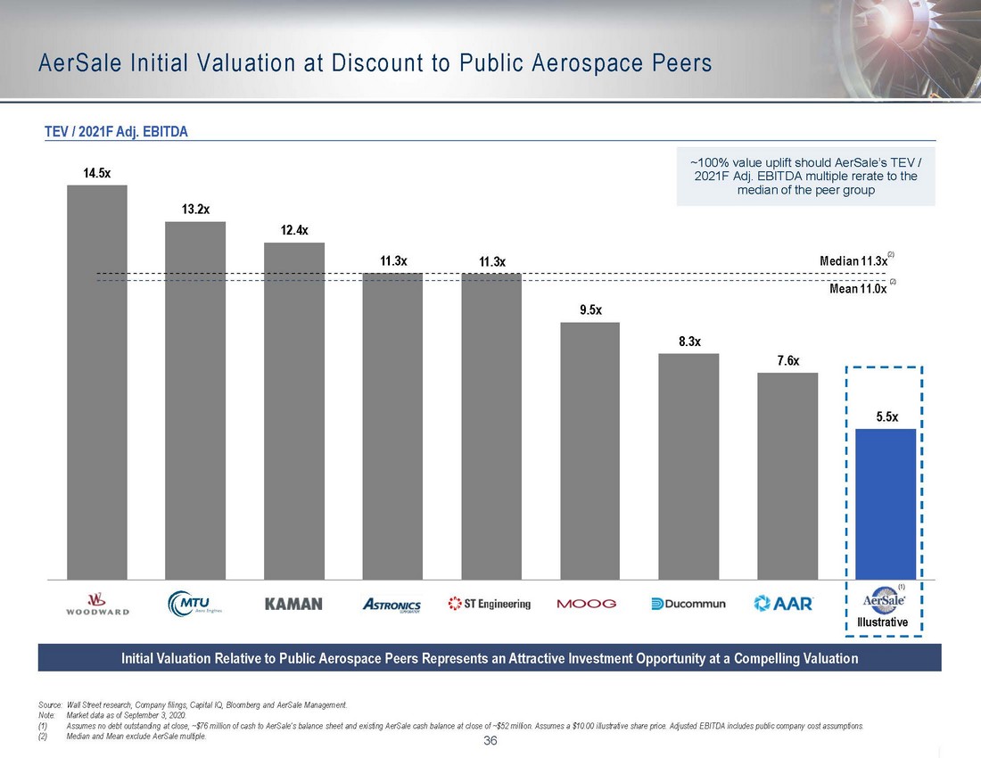 36 14.5x 13.2x 12.4x 11.3x 11.3x 9.5x 8.3x 7.6x 5.5x Median 11.3x Mean 11.0x AerSale Initial Valuation at Discount to Public Aerospace Peers 36 Source: Wall Street research, Company filings, Capital IQ, Bloomberg and AerSale Management. Note: Market data as of September 3, 2020. (1) Assumes no debt outstanding at close, ~$76 million of cash to AerSale’s balance sheet and existing AerSale cash balance at cl ose of ~$52 million. Assumes a $10.00 illustrative share price. Adjusted EBITDA includes public company cost assumptions. (2) Median and Mean exclude AerSale multiple. TEV / 2021F Adj. EBITDA ~100% value uplift should AerSale’s TEV / 2021F Adj. EBITDA multiple rerate to the median of the peer group Illustrative (2) Initial Valuation Relative to Public Aerospace Peers Represents an Attractive Investment Opportunity at a Compelling Valuatio n (1) (2)