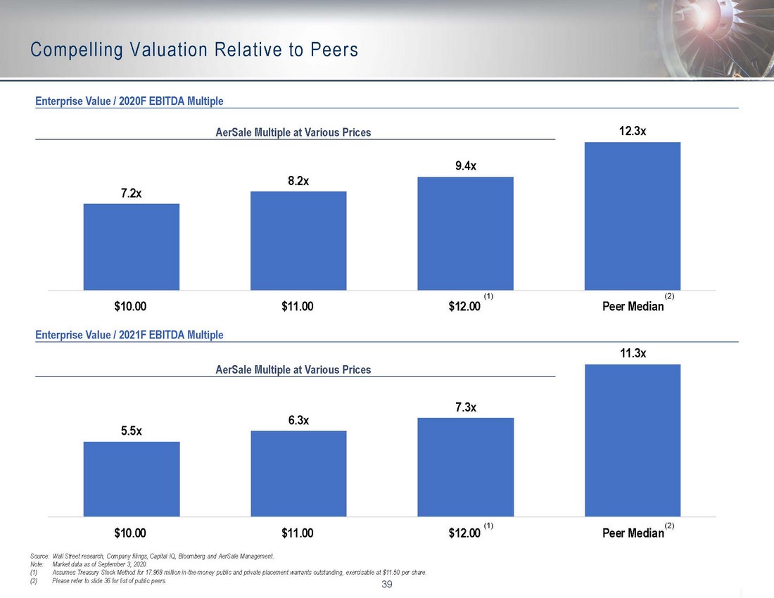 38 18.4% 17.6% 17.4% 15.2% 13.8% 12.8% 11.1% 7.4% 6.5% Median 13.3% Operational Benchmarking 2018A - 2021F Revenue Growth CAGR 2021F EBITDA Margin (2) (3) (3) (1) (1) (2) Source: Wall Street research, Company filings, Capital IQ, Bloomberg and AerSale Management. Note: Market data as of September 3, 2020. (1) Pro forma adjusted figures include the run - rate contribution of recent acquisitions, public company cost assumptions, CARES Act contributions and exclude impairment charges. (2) Pro forma for sale of distribution segment to Littlejohn. (3) Median excludes AerSale multiple. 5.2% 3.5% 3.2% 1.0% 0.9% 0.9% (0.8%) (2.7%) (13.6%) Median 0.9%