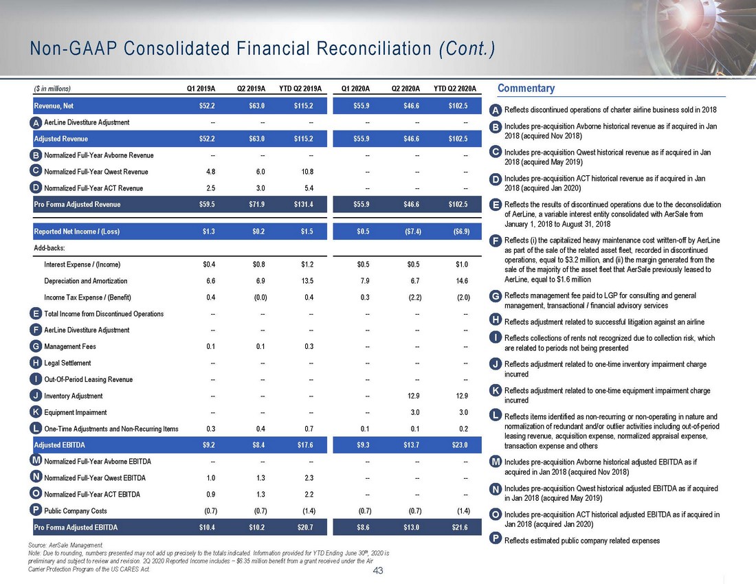 42 FY Ending December 31st, ($ in millions) 2018A 2019A Revenue, Net $290.7 $304.2 AerLine Divestiture Adjustment (53.7) -- Adjusted Revenue $237.0 $304.2 Normalized Full-Year Avborne Revenue 15.6 -- Normalized Full-Year Qwest Revenue 19.0 10.8 Normalized Full-Year ACT Revenue 7.9 9.9 Pro Forma Adjusted Revenue $279.5 $324.9 Reported Net Income / (Loss) $48.0 $15.5 Add-backs: Interest Expense / (Income) $2.4 $3.0 Depreciation and Amortization 29.8 30.1 Income Tax Expense / (Benefit) (3.2) 4.2 Total Income from Discontinued Operations (21.3) -- AerLine Divestiture Adjustment (4.8) -- Management Fees 0.6 0.6 Legal Settlement (3.0) -- Out-Of-Period Leasing Revenue (1.6) -- Inventory Adjustment -- -- Equipment Impairment -- -- One-Time Adjustments and Non-Recurring Items 0.9 3.6 Adjusted EBITDA $47.8 $56.9 Normalized Full-Year Avborne EBITDA 1.1 -- Normalized Full-Year Qwest EBITDA 4.2 2.3 Normalized Full-Year ACT EBITDA 3.2 3.8 Public Company Costs (2.8) (2.8) Pro Forma Adjusted EBITDA $53.5 $60.2 42 Non - GAAP Consolidated Financial Reconciliation A B C G I J Commentary Reflects discontinued operations of charter airline business sold in 2018 Includes pre - acquisition Avborne historical revenue as if acquired in Jan 2018 (acquired Nov 2018) Includes pre - acquisition Qwest historical revenue as if acquired in Jan 2018 (acquired May 2019) Includes pre - acquisition ACT historical revenue as if acquired in Jan 2018 (acquired Jan 2020) Reflects the results of discontinued operations due to the deconsolidation of AerLine, a variable interest entity consolidated with AerSale from January 1, 2018 to August 31, 2018 Reflects (i) the capitalized heavy maintenance cost written - off by AerLine as part of the sale of the related asset fleet, recorded in discontinued operations, equal to $3.2 million, and (ii) the margin generated from the sale of the majority of the asset fleet that AerSale previously leased to AerLine, equal to $1.6 million Reflects management fee paid to LGP for consulting and general management, transactional / financial advisory services Reflects adjustment related to successful litigation against an airline Reflects collections of rents not recognized due to collection risk, which are related to periods not being presented Reflects adjustment related to one - time inventory impairment charge incurred Reflects adjustment related to one - time equipment impairment charge incurred Reflects items identified as non - recurring or non - operating in nature and normalization of redundant and/or outlier activities including out - of - period leasing revenue, acquisition expense, normalized appraisal expense, transaction expense and others Includes pre - acquisition Avborne historical adjusted EBITDA as if acquired in Jan 2018 (acquired Nov 2018) Includes pre - acquisition Qwest historical adjusted EBITDA as if acquired in Jan 2018 (acquired May 2019) Includes pre - acquisition ACT historical adjusted EBITDA as if acquired in Jan 2018 (acquired Jan 2020) Reflects estimated public company related expenses A B C D E F G I J E D K F K H H L M N O P L M N O P Source: AerSale Management. Note: Due to rounding, numbers presented may not add up precisely to the totals indicated.