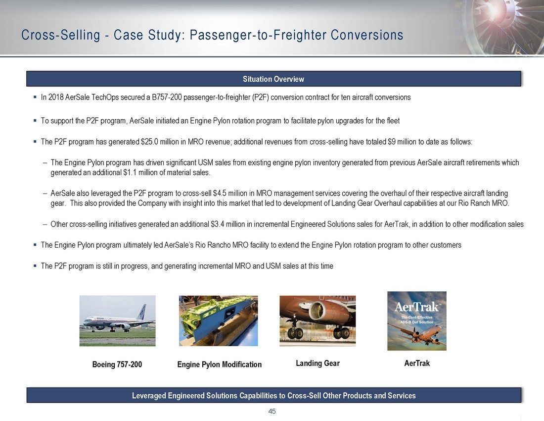 44 Disciplined Acquisition of Targeted Flight Equipment Feedstock AerSale’s Formal Feedstock Procurement Process Efficiently Manages Capital Optimal Business Unit Assignment Rolling 500 – 600 Aircraft and Engines Tracked Weekly Feedstock Procurement Review Meeting Final Review Execution AerSale assimilates proprietary real - time and historical data from its specialized sales, leasing, air field storage, USM, and MRO business units , including market supply, demand, pricing and return - to - service MRO cost Validated modeling inputs are subsequently processed by the Company’s established financial planning & analysis methodologies to confirm investment decisions Comprehensive inter - business unit inspection and valuation data are further verified and refined to produce predictive modeling inputs through proprietary valuation process Ultimate investment decision based on profitability of optimized monetizing alternatives Deep technical knowledge and market expertise leads to highly informed decisions x Identification of highest yield products and services across all mid - technology commercial transport category civil and government compatible aircraft platforms x Identification of all alternative investment exit paths to further minimize financial risk x
