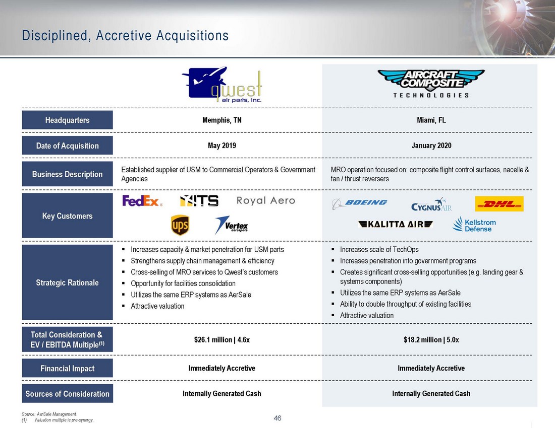 45 Cross - Selling - Case Study: Passenger - to - Freighter Conversions ▪ In 2018 AerSale TechOps secured a B757 - 200 passenger - to - freighter (P2F) conversion contract for ten aircraft conversions ▪ To support the P2F program, AerSale initiated an Engine Pylon rotation program to facilitate pylon upgrades for the fleet ▪ The P2F program has generated $25.0 million in MRO revenue; additional revenues from cross - selling have totaled $9 million to da te as follows: The Engine Pylon program has driven significant USM sales from existing engine pylon inventory generated from previous AerSal e a ircraft retirements which generated an additional $1.1 million of material sales. AerSale also leveraged the P2F program to cross - sell $4.5 million in MRO management services covering the overhaul of their resp ective aircraft landing gear. This also provided the Company with insight into this market that led to development of Landing Gear Overhaul capabili tie s at our Rio Ranch MRO. Other cross - selling initiatives generated an additional $3.4 million in incremental Engineered Solutions sales for AerTrak, in a ddition to other modification sales ▪ The Engine Pylon program ultimately led AerSale’s Rio Rancho MRO facility to extend the Engine Pylon rotation program to othe r c ustomers ▪ The P2F program is still in progress, and generating incremental MRO and USM sales at this time Boeing 757 - 200 AerTrak Landing Gear Engine Pylon Modification Situation Overview Leveraged Engineered Solutions Capabilities to Cross - Sell Other Products and Services